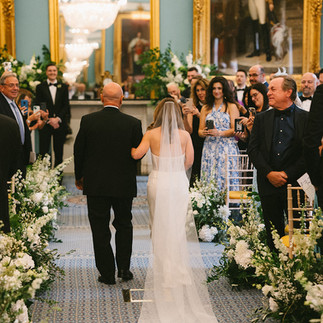 Framing the moment of their first kiss as newlyweds, two large pedestal urns overflowed with seasonal white flowers and textured foliage. A lush aisle of flowers added a romantic English garden feel to this historic space, softening the formality to create a fun and heartfelt experience which was filled with laughter.