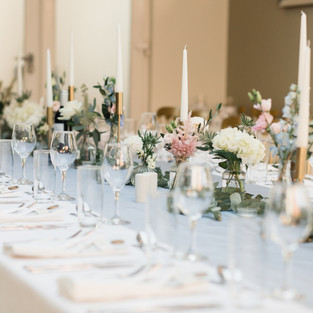 A long table at the Stanwell Hotel for their 32 guests seated on either side for an intimate dining celebration. Rachel found a lovely long silk runner for the centre of the table and taper candles and tealights were spread down the centre. We used a selection different bud vases filled with beautiful flowers that were in the Pedestal arrangements and also the bouquets. Low level and spaced down the centre of the long table allowed guests to talk easily across the dining table.